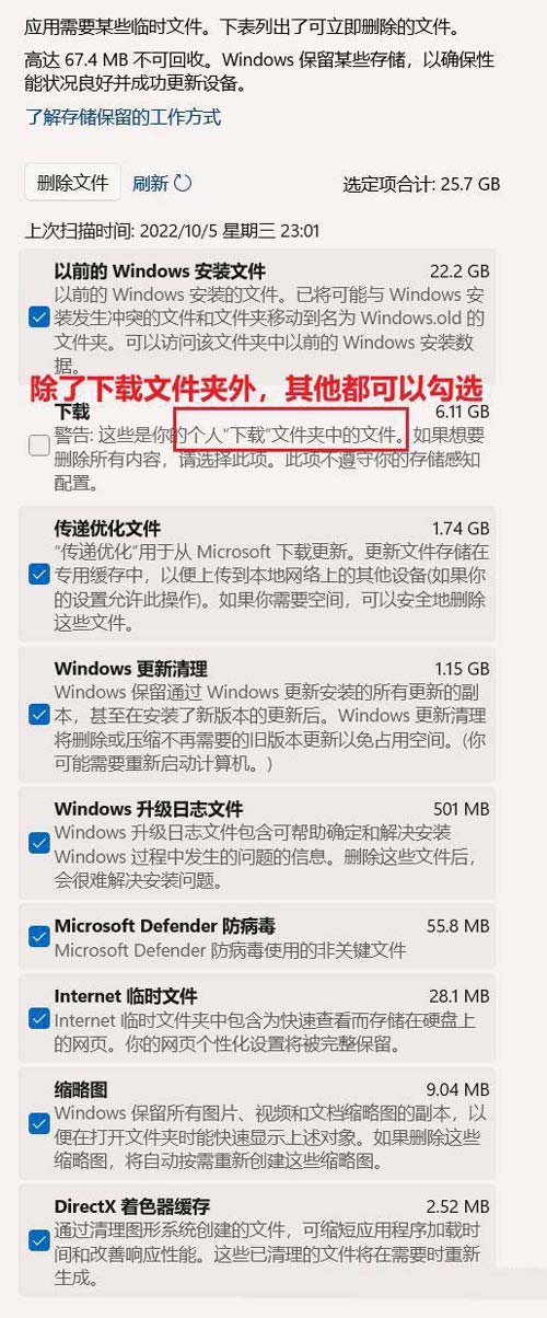 4、进入临时文件页面,可以看到当前系统中所有的临时文件项目,准确来说,这里的临时文件都是可以删掉的,但是系统把个人账户下的下载文件夹也定义为临时文件夹,如果你不想删除下载文件夹里面的文件,这个项目可以不勾选。勾选【以前的 Windows 安装文件】,然后点击【删除文件】,即可进行删除Windows.old文件夹操作;